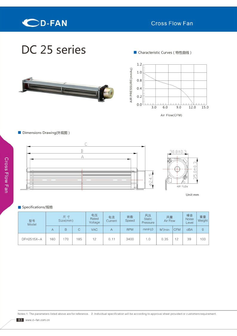 DC FAN橫流風扇025具有非常複雜的內部結構。盡管其葉輪周向是對稱的, 但氣流流動卻是非對稱性, 其相對速度場與速度場都不穩定, 流動介質兩次進入葉輪, 轉子葉輪沿著周向流動情況不斷改變。在葉輪圓周一邊的內側存在一個能夠控製整個氣流流動的漩渦, 即所謂橫流風機的偏心渦。渦流中心在葉輪內周的某處, 並隨著節流情況的不同而沿著圓周方向移動, 正是此偏心渦的存在引起貫流。在工況下, 橫流風機在高轉速時由於偏心渦的控製力增強, 橫流風機內氣體不能正常排出或吸入, 試驗係統出現異常狀況, 即所謂喘振現象。